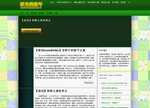 “逆光的童年”这一网站主要了表达了本组成员对于城市里弱势儿童们的关注,取材来自五个方面:外来务工人员的苦二代、城市留守儿童、残障儿童、帮助力量以及声音。